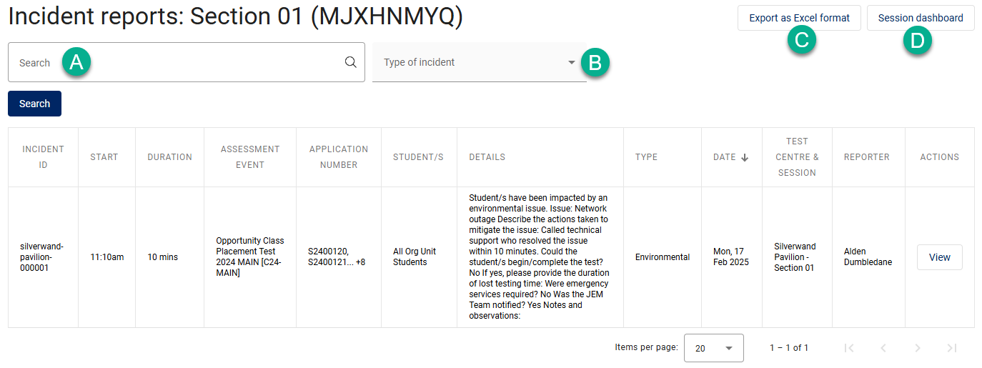 A list of incidents associated with the specific test session is displayed. The page includes features labelled A to D: